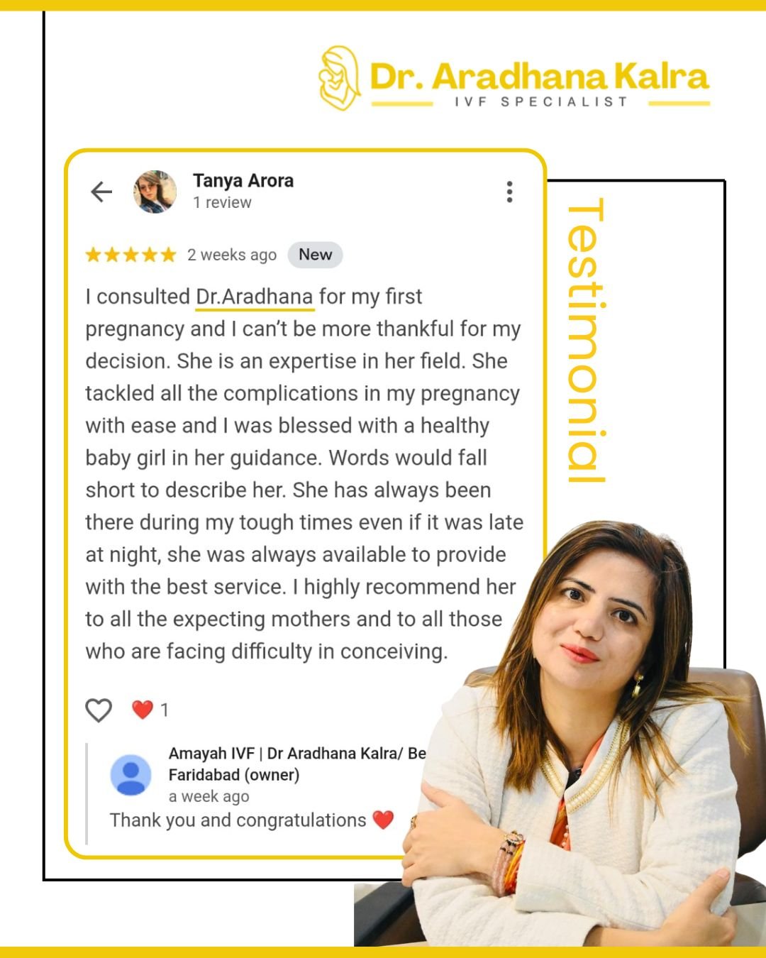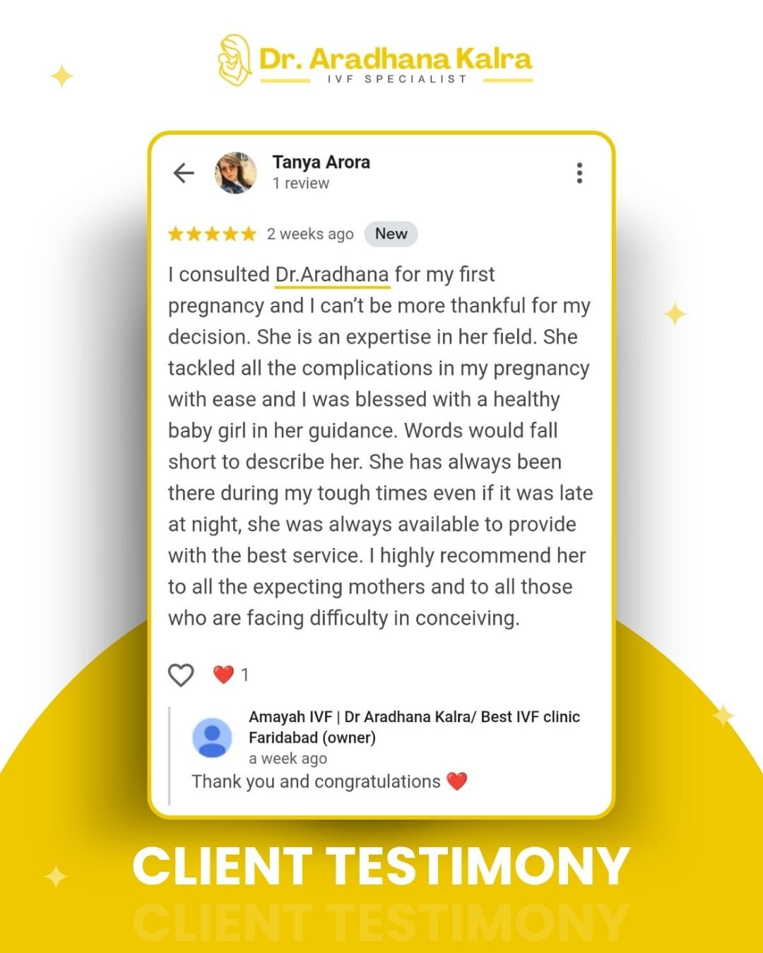 Posted on anuradha chaudharyTrustindex verifies that the original source of the review is Google. Dr. Aradhna is the best Fertility Expert in Faridabad. I'm blessed to get treatment from her.. it's like a miracle that I got the good news in my very first attempt after 03 years of marriage.. thank you Dr. Aradhna for spreading happiness in our lives.... would highly recommend her for all the aspiring parents.. lots of gratitude...Posted on Deepti NayakTrustindex verifies that the original source of the review is Google. Dr.Aradhana is a good fertility expert & has assisted us well in our fertility journey. She even asist us in pregnancy journey during each consultation & has a good record as gynaecologist and fertility expertPosted on Benny GeorgeTrustindex verifies that the original source of the review is Google. Dr. Aradhana kalra is turly outstanding she takes the time to understand your concerns and offers clear, thoughful guidance throughout the treatment process. Her approch is both professional and compassionate making feel completely at ease. I appreciated how through she was and how she explained every step in detail. I'm extremely satisfied with my experience thank you docPosted on Swati SinghTrustindex verifies that the original source of the review is Google. Dr. Aradhana Kalra is an exceptional doctor who combines deep medical expertise genuine care for her patients. From this moment I stepped into her clinic, I felt welcomed and at ease she listened patiently to all my concern, explained the diagnosis clearly, and provided a treatment plan that was both effective and reassuring . I highly recommend Dr. Kalra to anyone looking for a trustworthy and compassionate medical professionalPosted on Preeti MehendirattaTrustindex verifies that the original source of the review is Google. Words fall short when we talk about her; she is a true angel who does miracles and gives memories to each one of us. One of the finest & best doctors, and I would recommend her and also tell everyone in my acquaintance if nothing is working out; she is there for all of us. Lots of love & respect, Mam. π€Posted on randhir singh gusainTrustindex verifies that the original source of the review is Google. Nice ivf centre co operative staffPosted on Piyush KumarTrustindex verifies that the original source of the review is Google. World's Best DoctorPosted on Shalini KathuriaTrustindex verifies that the original source of the review is Google. Dr.Β AradhanaΒ isΒ aΒ well-knownΒ expertΒ in infertility treatment.SinceΒ myΒ condition wasΒ complicatedΒ becauseΒ ofΒ myΒ lowΒ AMHΒ value,Β IΒ sawΒ aΒ lotΒ ofΒ doctors,Β butΒ noneΒ ofΒ themΒ wereΒ ableΒ toΒ giveΒ meΒ theΒ sameΒ degreeΒ ofΒ motivation.As a resultΒ ofΒ Dr.Β Aradhana'sΒ excellentΒ adviceΒ andΒ tremendousΒ inspiration, MyΒ fearΒ ofΒ IVFΒ was reducedΒ and IΒ gainedΒ the courageΒ toΒ undergo thisΒ treatment. TheΒ nicestΒ thingΒ IΒ appreciateΒ mostΒ aboutΒ herΒ isΒ thatΒ sheΒ listensΒ wellΒ andΒ willΒ suggestΒ theΒ bestΒ treatment based on patient 's condition ratherΒ thanΒ theΒ mostΒ costly one. ThankΒ youΒ veryΒ muchΒ forΒ yourΒ assistanceΒ during my journey.
